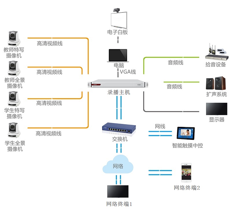 主講教師只需要一臺(互動、錄播、跟蹤、音頻)四合一主機,芯片級整合,精品錄播效果,專業(yè)級互動視頻質(zhì)量。